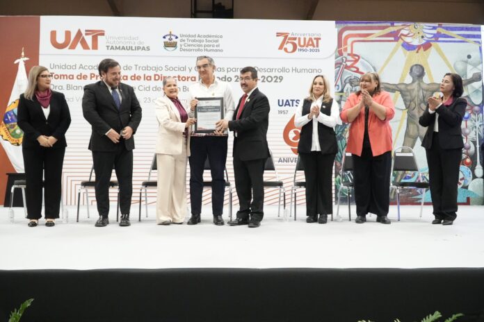 Ciudad Victoria, Tam.- Teniendo como testigo de honor al gobernador Américo Villarreal Anaya, el rector de la Universidad Autónoma de Tamaulipas (UAT), Dámaso Anaya Alvarado, le tomó protesta a la nueva directora de la Unidad Académica de Trabajo Social y Ciencias para el Desarrollo Humano (UATSCDH), Dra. Blanca Guadalupe Cid de León Bujanos, quien asume el cargo para el periodo 2025-2029.
