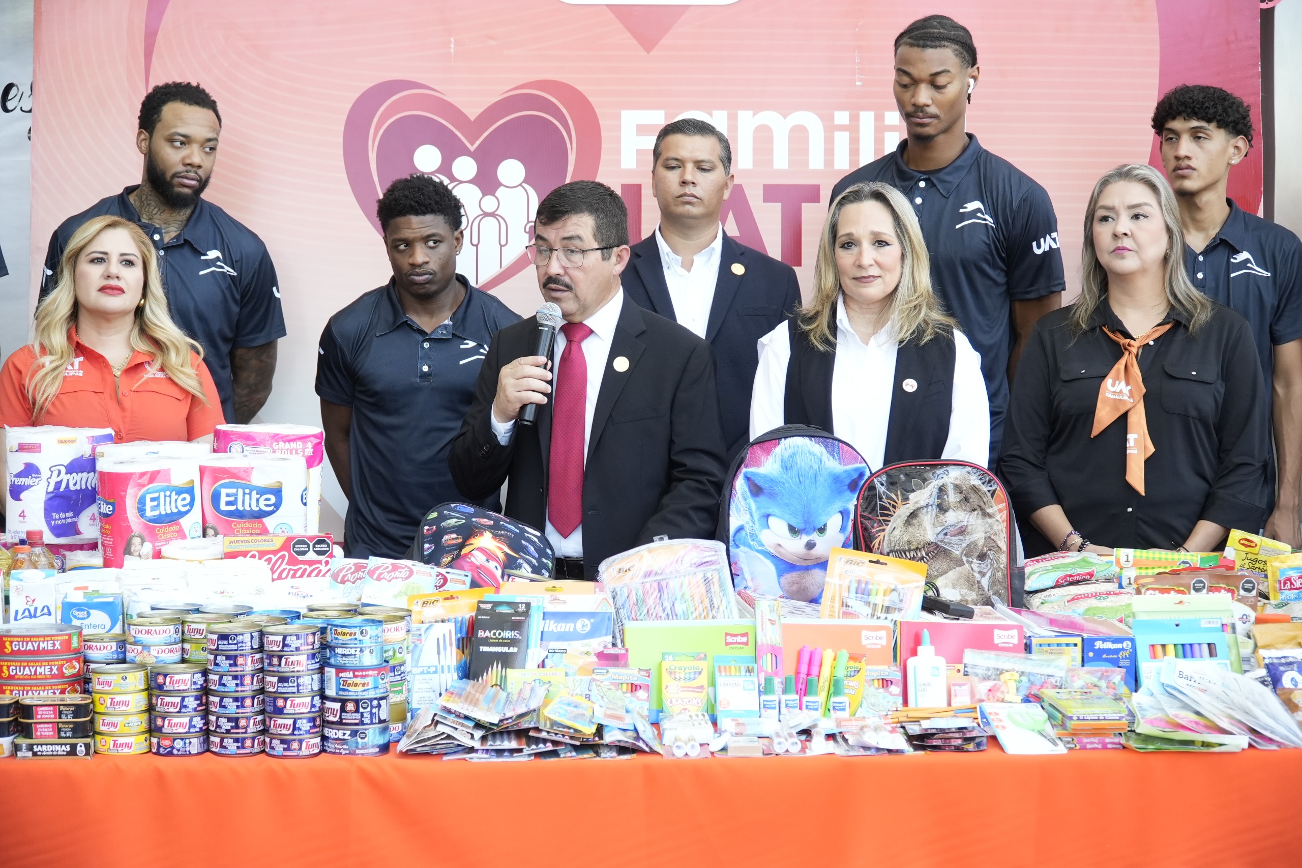 Ciudad Victoria, Tam.- El rector de la Universidad Autónoma de Tamaulipas, Dámaso Anaya Alvarado, acompañado de su esposa, la Lic. Isolda Rendón de Anaya, presidenta de Familia UAT, recibió, del Club Correcaminos de basquetbol profesional (Correbasket), un donativo de víveres y útiles escolares recaudados por el equipo durante sus encuentros en el Gimnasio Multidisciplinario de Victoria, dentro de la Temporada 2025 de la Liga Caliente MX LNBP.