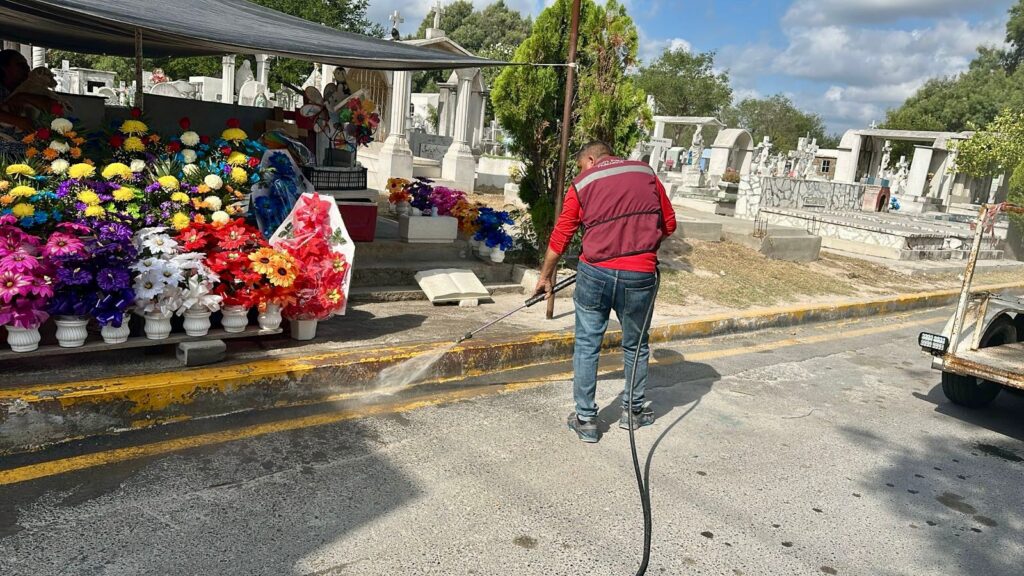 Reynosa, Tam.-  Con el objetivo de ofrecer espacios seguros y limpios para los visitantes, el Gobierno Municipal de Reynosa, encabezado por el Presidente Carlos Peña Ortiz, ha puesto en marcha un operativo de limpieza y fumigación en los panteones municipales, incluyendo el Sagrado Corazón.