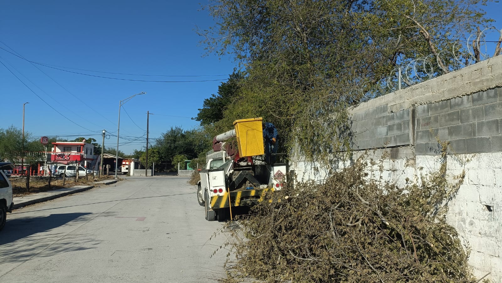 Reynosa, Tam.- En seguimiento a las instrucciones del Presidente Municipal de Reynosa, Carlos Peña Ortiz, cuadrillas de Servicios Públicos detallan los árboles de la escuela primaria Pedro María Anaya, de la colonia Lampacitos, con la finalidad de mejorar su vitalidad y sigan siendo útiles.