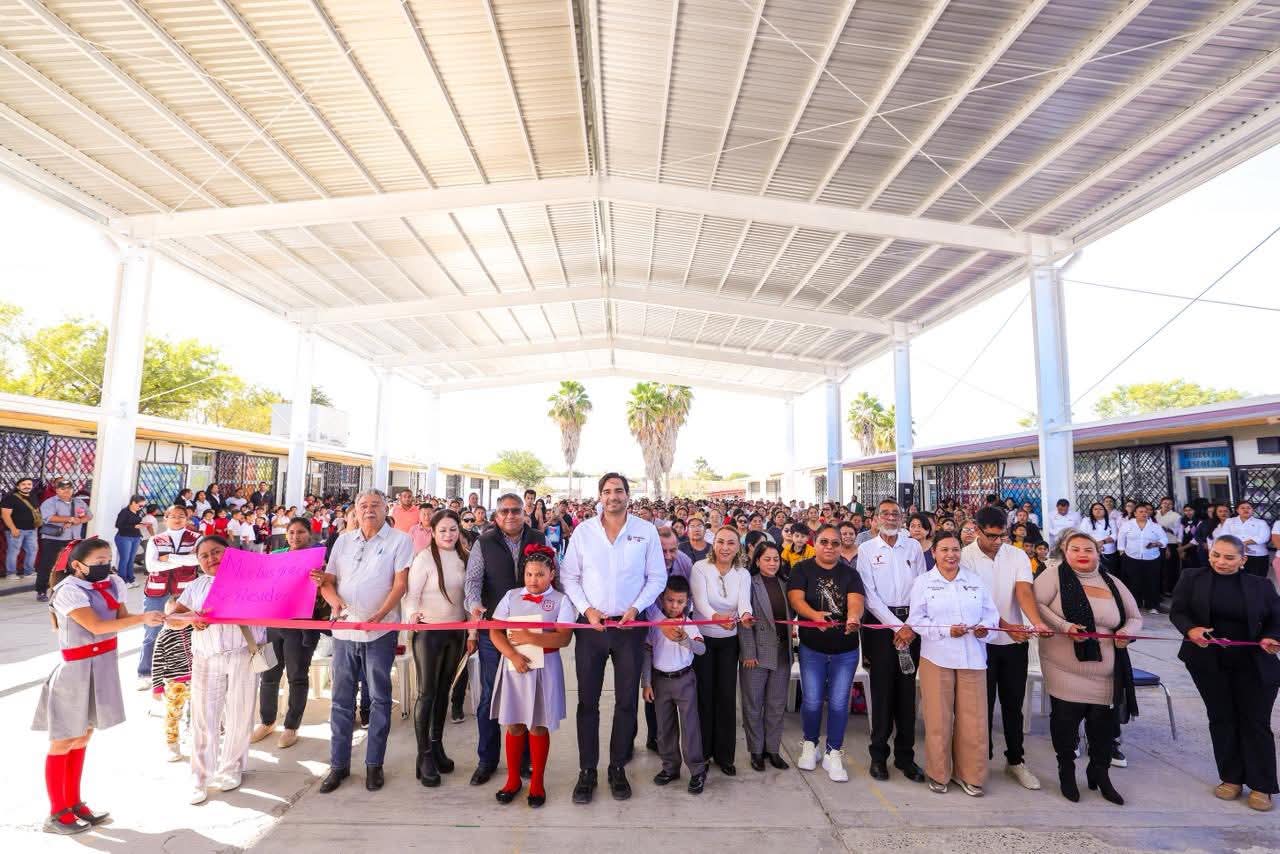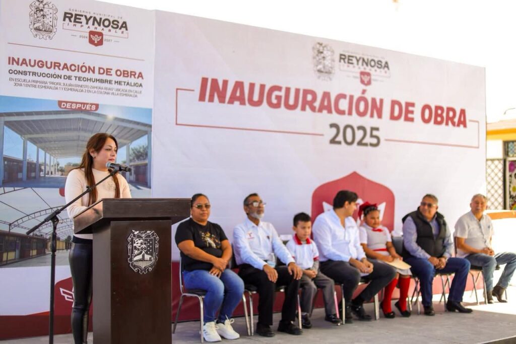 Reynosa, Tam. – «Estamos de fiesta el día de hoy con los padres de familia, inaugurando esta techumbre para que los niños y niñas de esta noble institución puedan llevar a cabo sus actividades sin importar el solazo que tenemos aquí en esta región del norte de Tamaulipas», dijo con entusiasmo el Alcalde de Reynosa, Carlos Peña Ortiz, quien además anunció la pavimentación de una calle lateral a la escuela primaria Julián Ernesto Zamora Rivas, de la colonia Villa Esmeralda.