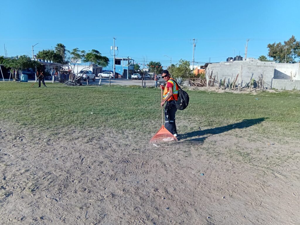– Limpieza, chapoleo, papeleo, barrido y raspado en Plaza de la colonia Valle Soleado, calle Paseo del Sol con calle Paseo del Desierto.