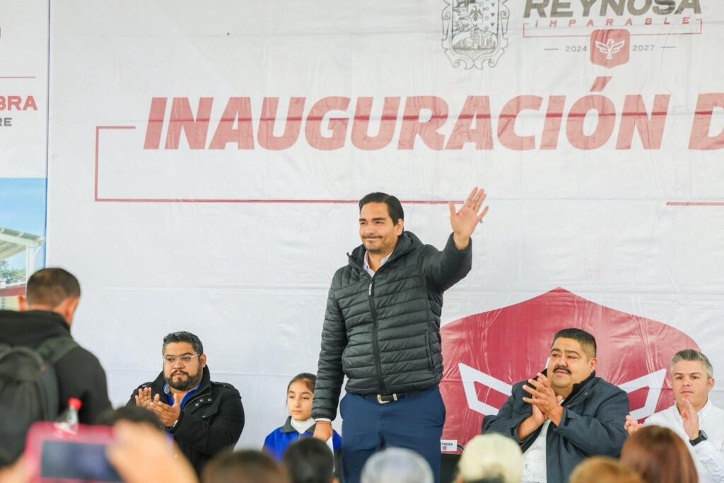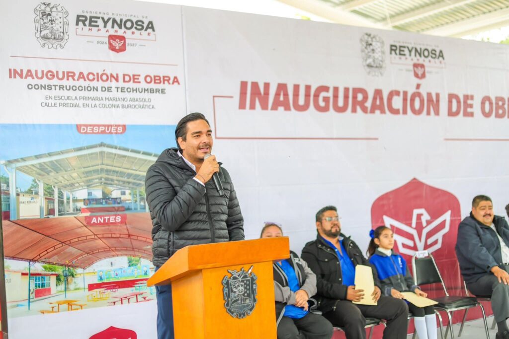 Reynosa, Tam.- Un impulso más para fortalecer la educación en Reynosa, fue materializado por el Alcalde Carlos Peña Ortiz, al entregar una techumbre metálica de 400 metros cuadrados a la comunidad escolar de la primaria Mariano Abasolo, que dirige Javier Abdiel Valdiviezo Salazar, quien estuvo acompañado por la niña Camila Yired Altamirano Moreno, alumna de sexto grado.