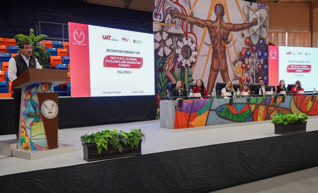 Cd. Victoria, Tam.- El rector de la Universidad Autónoma de Tamaulipas, Dámaso Anaya Alvarado, presidió la Ceremonia de Entrega de Reconocimientos a Estudiantes de Primer Lugar, Excelencia, Egresados y Fidelidad, correspondiente al periodo Otoño 2025-3, del Centro de Idiomas para la Niñez y la Adolescencia (CEINA).