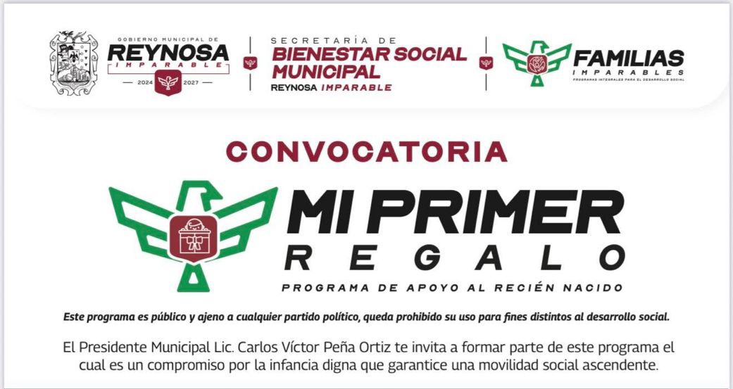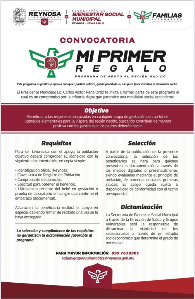 Reynosa, Tam.- El Presidente Municipal Carlos Peña Ortiz convoca a las mujeres embarazadas a inscribirse al programa de la Secretaría de Bienestar Social Municipal «Mi Primer Regalo», dirigido a residentes de esta localidad que podrán recibir el beneficio mediante el cumplimiento de sencillos requisitos.