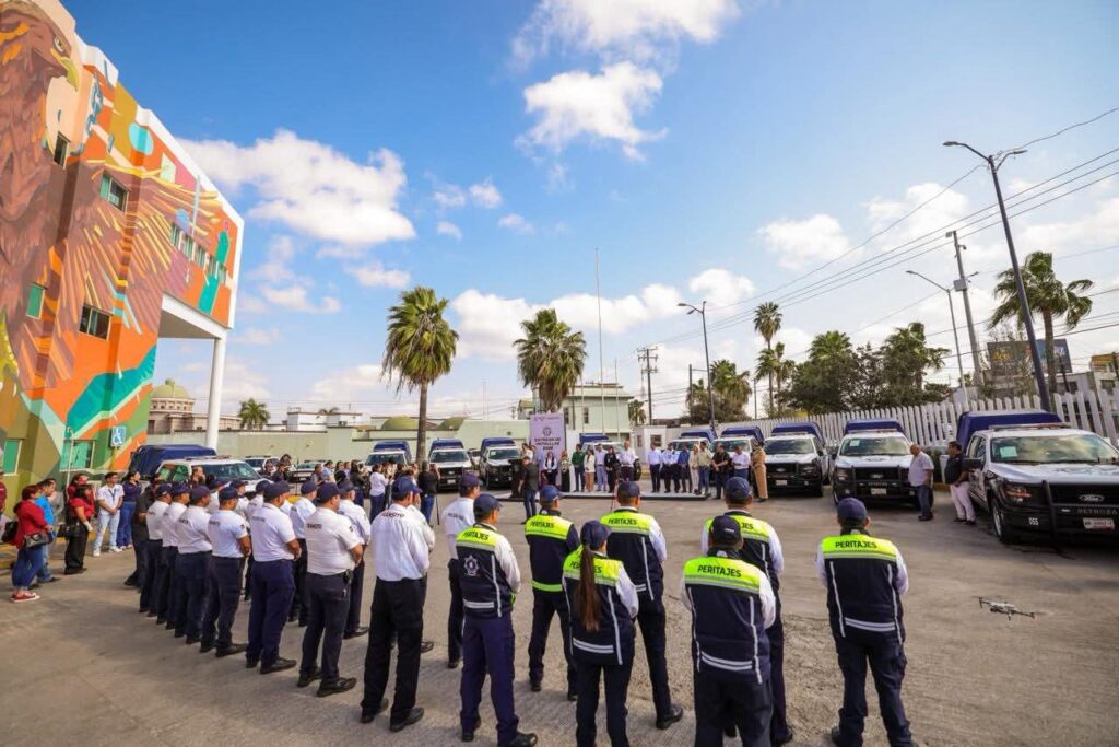 El Alcalde entregó las llaves de las nuevas unidades al Secretario de Seguridad Pública, Tránsito y Vialidad Municipal, Geovanni Barrios Moreno, quien estuvo acompañado por la Directora de Tránsito Iris Alondra Chavira Ríos y los elementos de la corporación, así como funcionarios municipales y miembros del Cabildo local.
