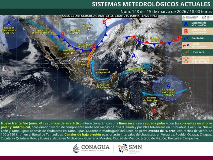 Reynosa, Tam.-  El Gobierno Municipal de Reynosa ofrece la información sobre el estado del tiempo en este inicio de semana. Después de un domingo caluroso con temperatura de hasta 40° Centígrados, el Frente Frío 41 provocará este lunes 16 de marzo, máxima de 21°, mínima de 11° y viento muy fuerte.