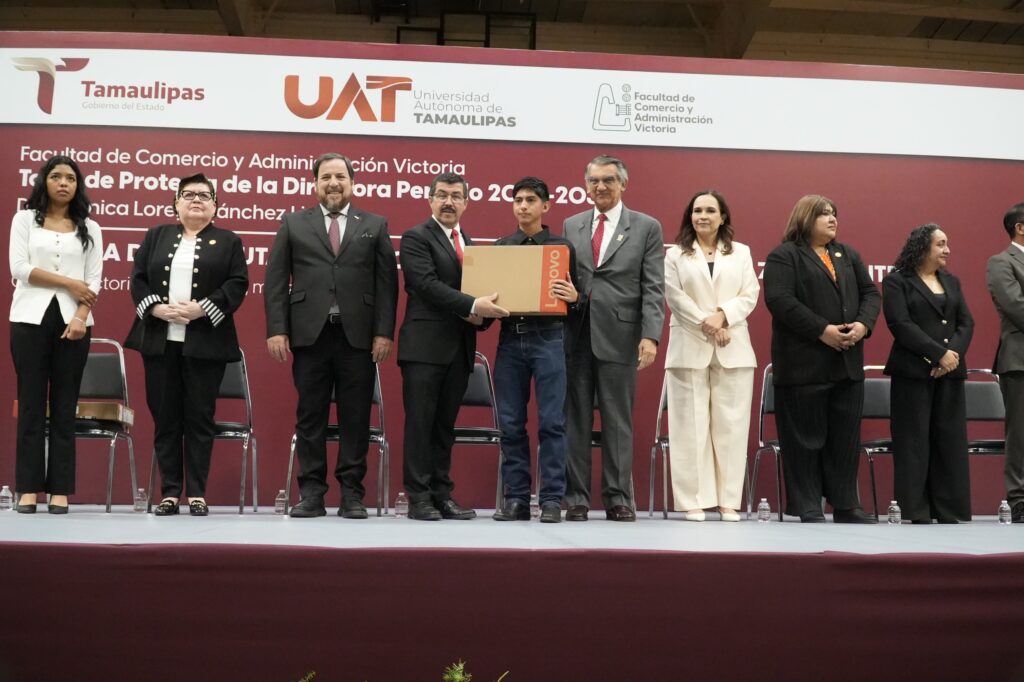 En este marco, hicieron entrega de computadoras portátiles a estudiantes de las facultades, unidades académicas y preparatorias de la UAT de Ciudad Victoria y Ciudad Mante, con el objetivo de fortalecer sus herramientas de aprendizaje.