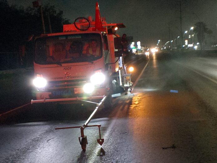 Como parte de la jornada pintaron la delimitación de carriles en el libramiento Reynosa-Río Bravo con pintura termoplástica blanca, material de alta durabilidad que refuerza la señalización horizontal en esta vía de alto flujo vehicular.